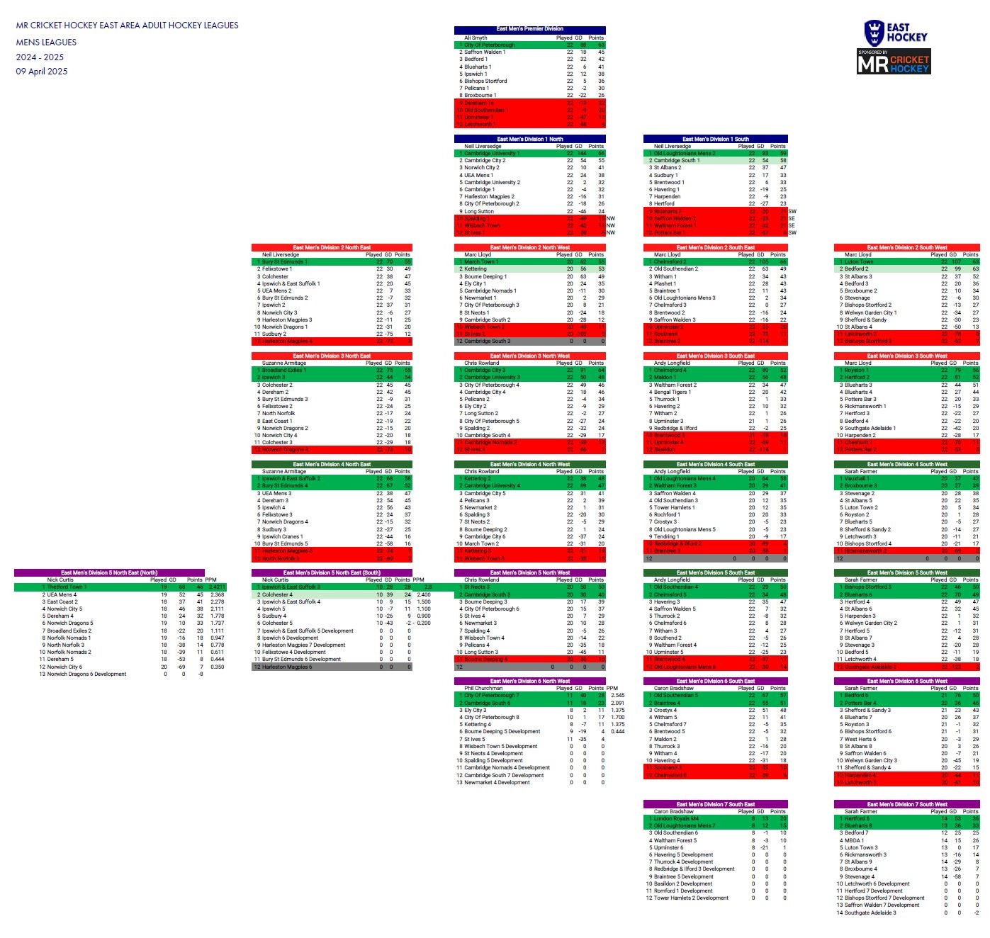 The "final" tables for the 2024-2025 season are saved here, promotion and relegation lines are based on no changes to team entries or team locations, whilst we are fairly certain on the promotion maths, relegations should be considered "advisory" until all the entries are in. If you have queries about future movements, do please get in touch with Phil Churchman (phil.churchman@outlook.com).